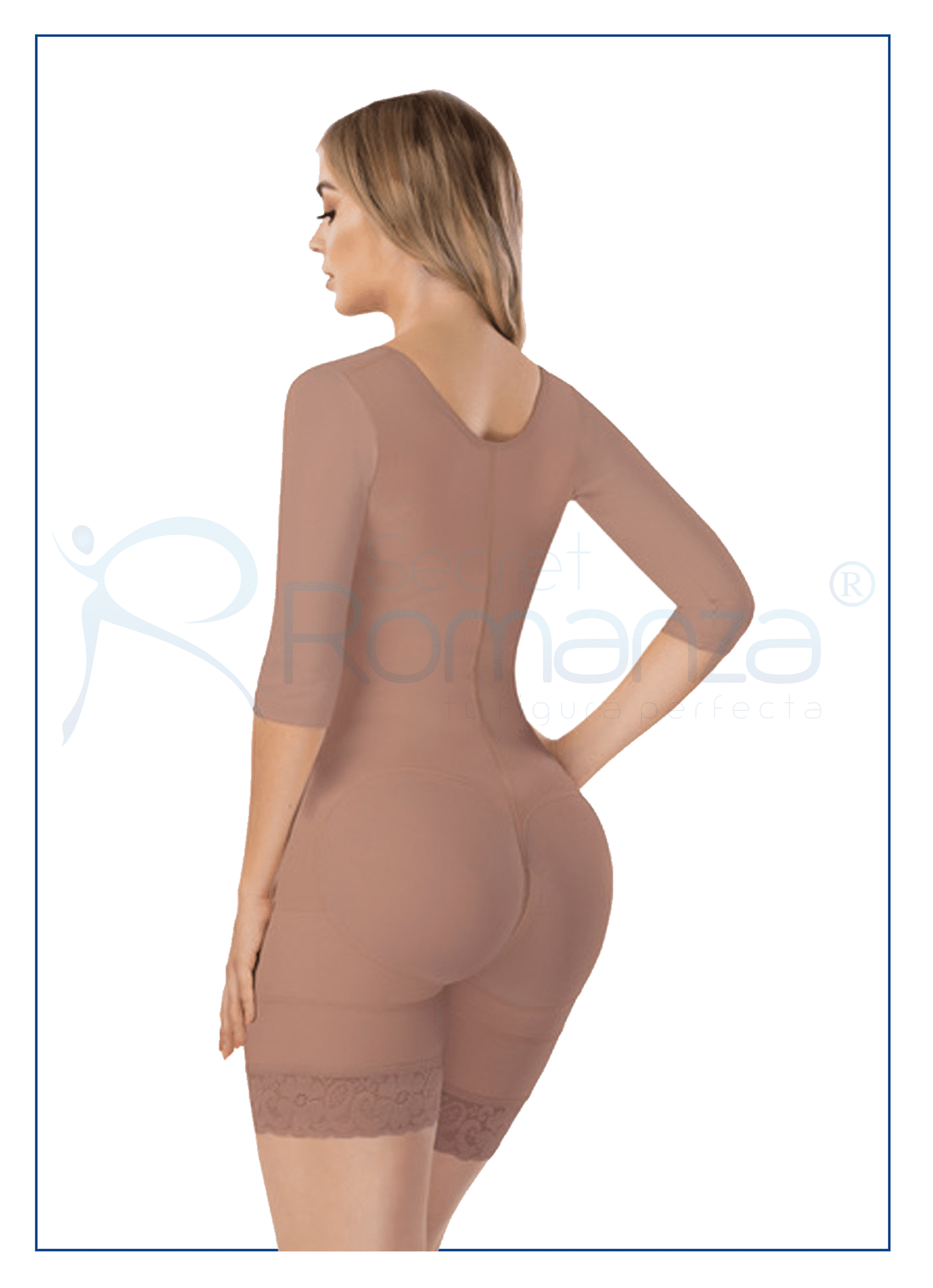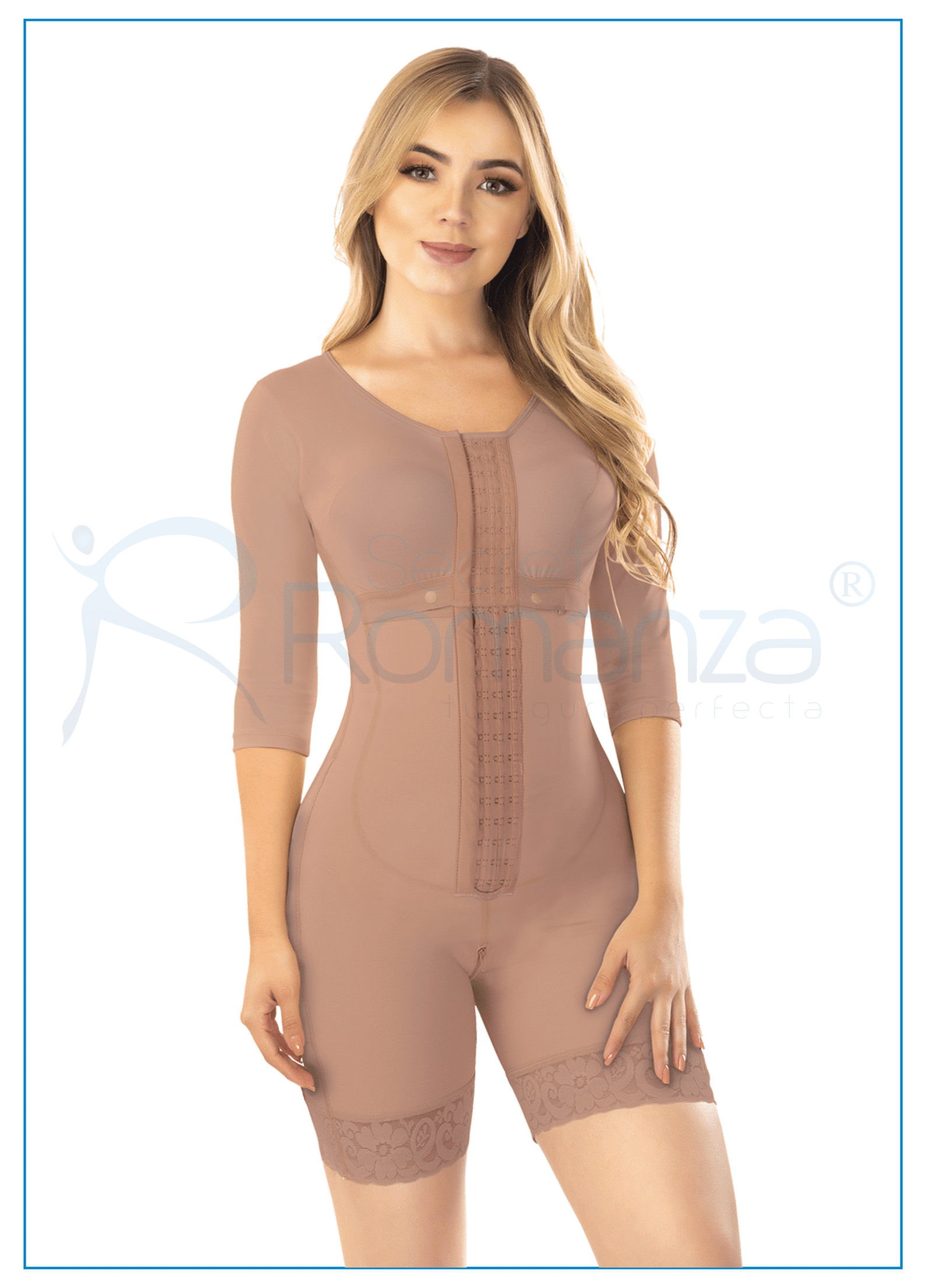 Faja Entera Short y brazos con 3 líneas de ganchos  para regular la compresión. Con sujetador prehormado en lycra ajustable a diferentes tamaños de pecho. Tirante elástico. 2 Tiras de ganchos en la zona de sujetador. Largo short en pierna con blonda con silicona de sujeción. Brazos en lycra ajustable